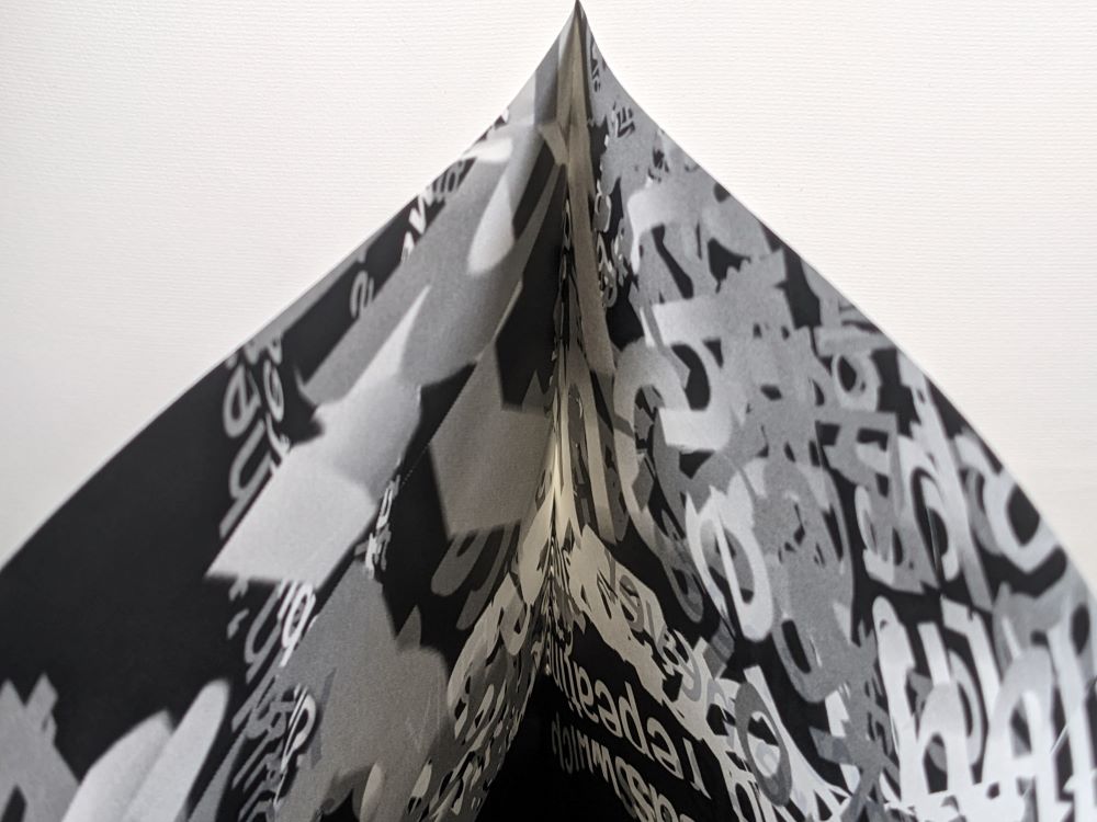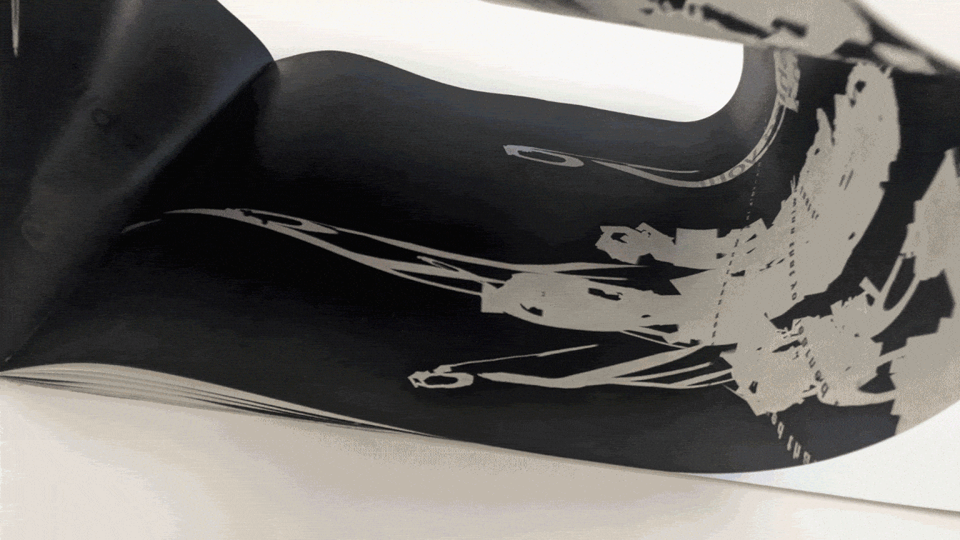 Additionally, I created a 17 by 11 landscape French-folded book, to use as a prop to aid my performance, to document the results using this interactive technology I found as a tool to create compositions, and to translate the VR experience to a book form. Focusing purely on micro-typography, the typesetting in the book corresponds to the graphics of the chapters, and the inside of the pages are images generated throughout the design process.