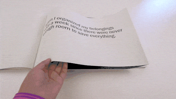 The three pieces of writing selected are my poetic interpretation of departure, wrestling with the anxiety of relocating to multiple places throughout my life. The chapters, Cloth, Bike, and Wind, correspond with the three VR scenes of black and white typography.