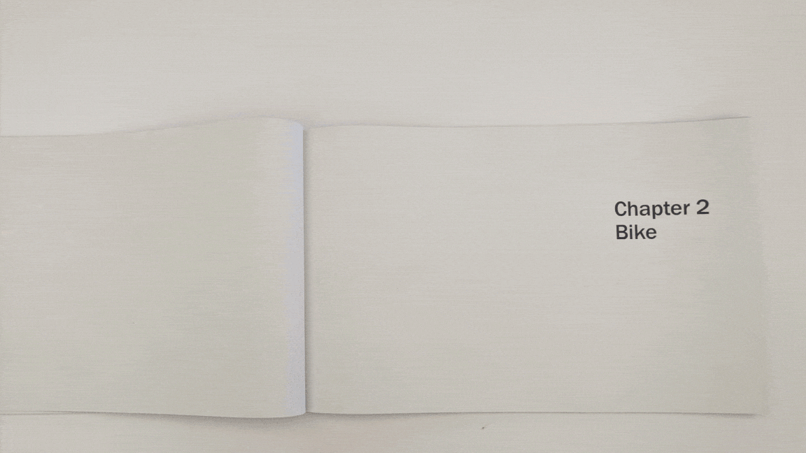 The different formats of writing give rise to the distinct styles of the three scenes, and the interactions are inspired by the titular objects. In the first chapter Cloth, paragraphs of texts are attached to fabric strips that shake with my gestures of book flipping. In the chapter Bike, short sentences are arranged into “wheels”, and my body language controls their position and rotation, leaving trails behind. In the third chapter Wind, each group of characters fall towards the floor plane, swaying with the wind force generated as I caress them.
