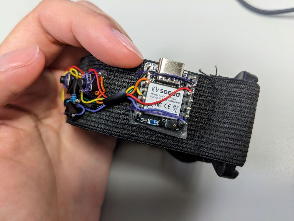 The device is a bracelet powered by Seeed Studio XIAO nRF52840 Sense, which has a gyroscope unit that collects the velocity and acceleration data of my hand gestures. With the bracelet on my right hand during the performance, the typographic motions in the scenes built in Unity respond to my body language.