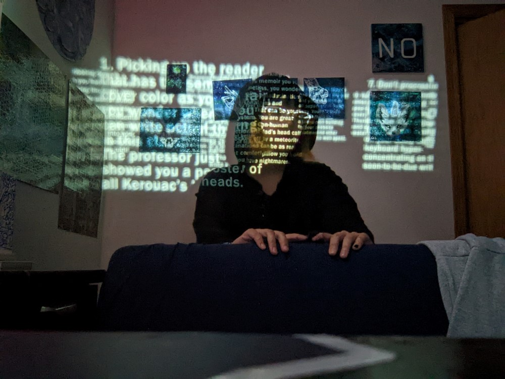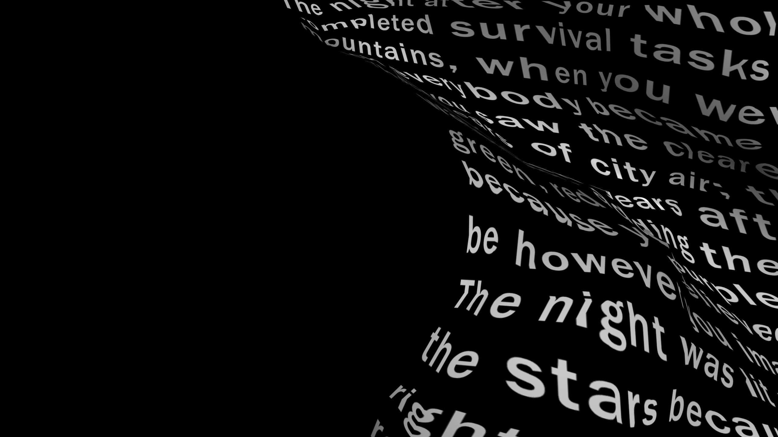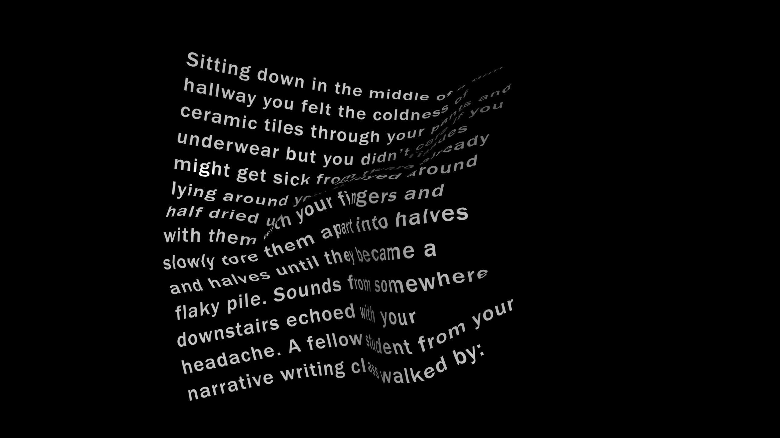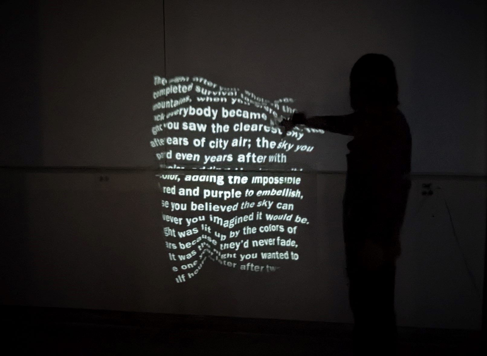 The text is selected from a collection of my own creative nonfiction writings. Originally titled “A Conversation”, the piece makes use of the second person point of view and stream of consciousness, and strings together a series of trivial yet sentimental events with common imageries. The installation aims to involve and engage viewers to experience the emotional turbulence, together with motions that disrupt the narration.